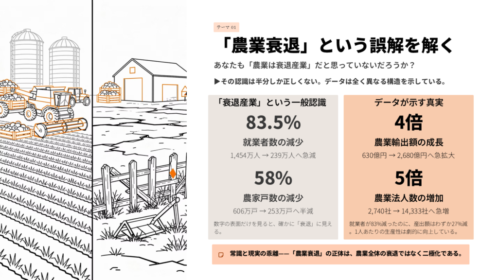 「衰退している」のは農業全体ではなく、一部の農家だけだとしたら。 皆さんの常識が、ここから少しずつ揺らぎ始めるかもしれません。