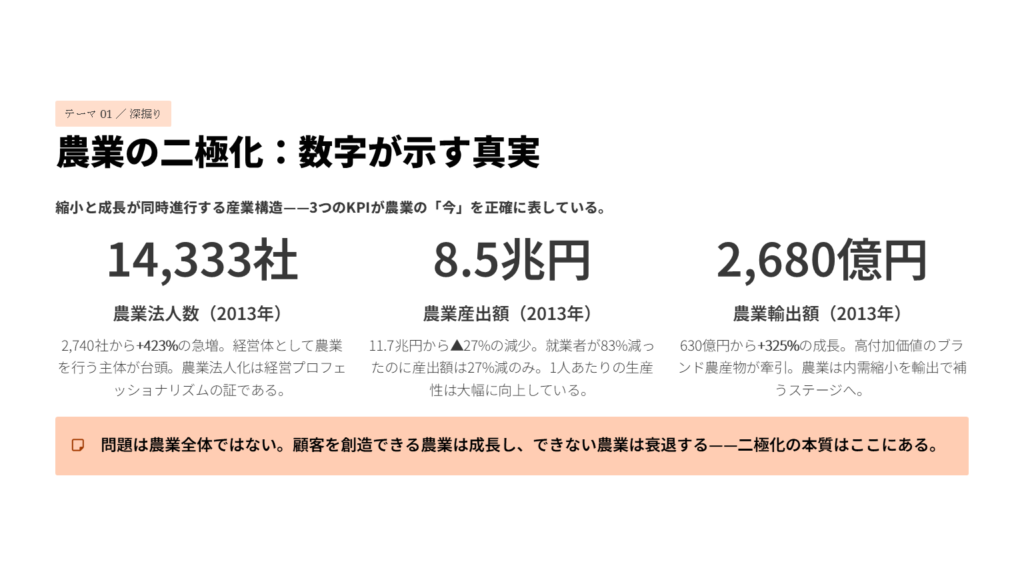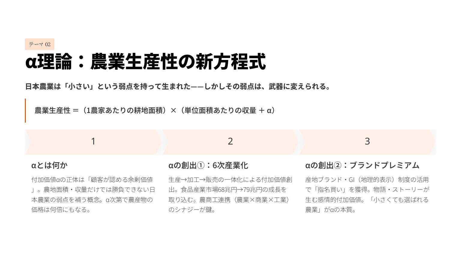 つまり、「農地の広さで勝負するな、付加価値で勝負せよ」というメッセージ。日本農業の狭農地性は宿命的ですが、だからこそ別のルートで成長できるという逆転の発想です。
