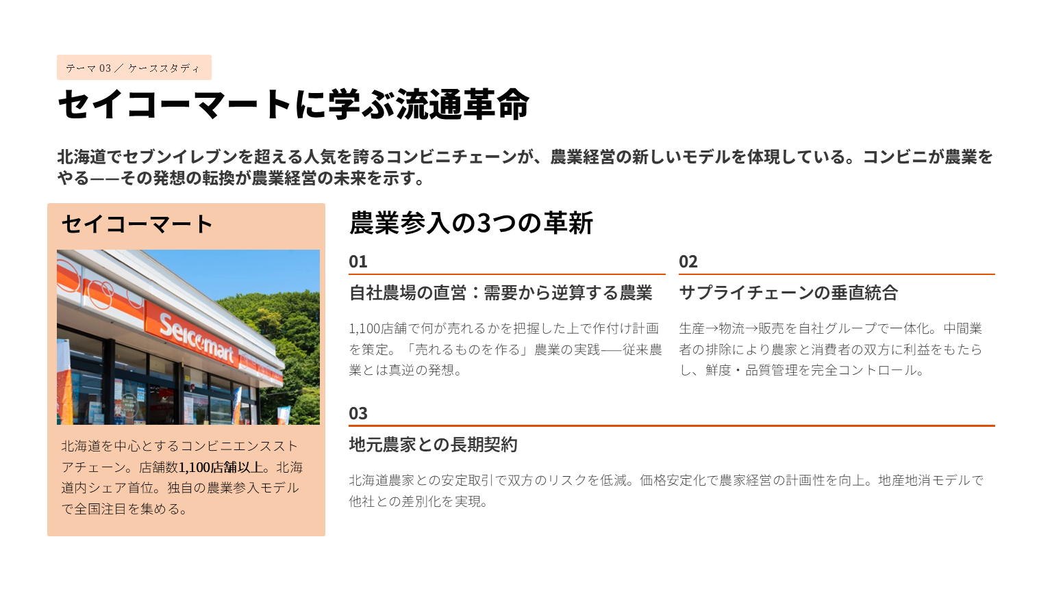 北海道のコンビニチェーン・セイコーマートは、卸売機能の自前化と北海道全域をカバーする配送網を構築。通常では出店しにくい僻地にも出店を可能にし、顧客満足度調査で3年連続No.1を獲得。さらには農業法人の設立にも参加し、農産物の本州出荷まで手がけています。流通業が農業に参入して成功した、農商工連携の先進事例です。