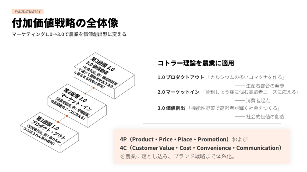 - マーケティング3.0:「機能性野菜で高齢者が輝く社会をつくる」