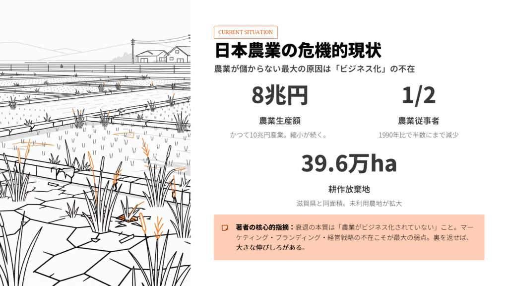 かつて10兆円産業と言われた日本農業は、現在8兆円台にまで縮小しています。農業従事者は1990年の半数にまで減少し、滋賀県と同面積の耕作放棄地が広がっている。数字だけ見れば暗い話ですよね。