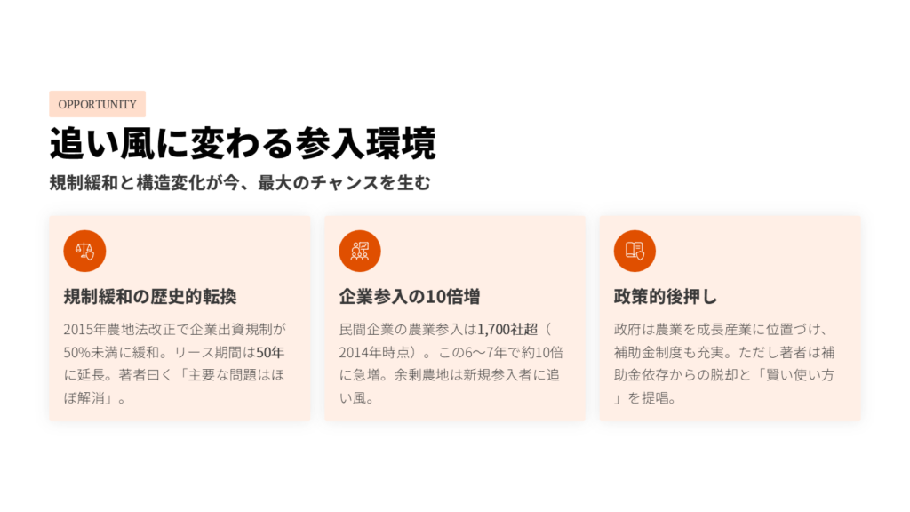 農業生産法人への出資規制が50%未満まで緩和され、農地リース期間は50年に延長。役員の農作業要件も大幅に見直されました。三輪さんの言葉を借りれば、「企業が農業ビジネスを行う際の主要な問題はほぼ解消されている」のです。
